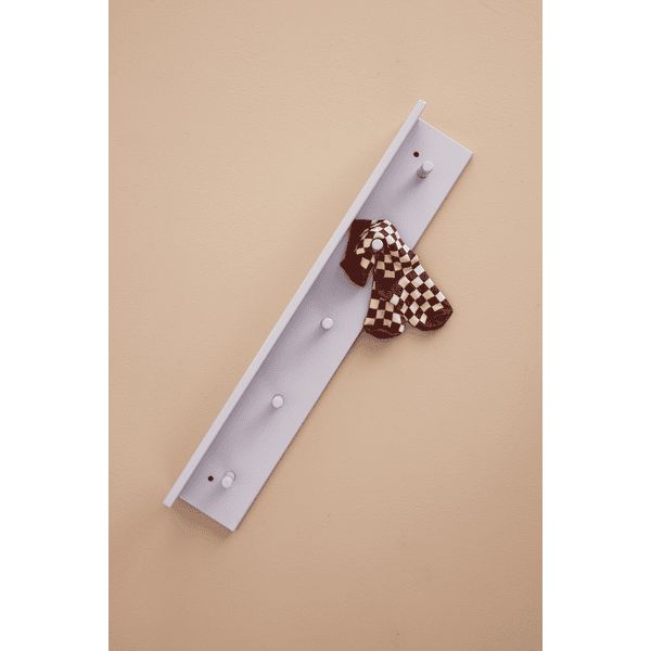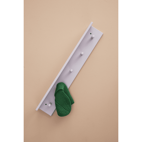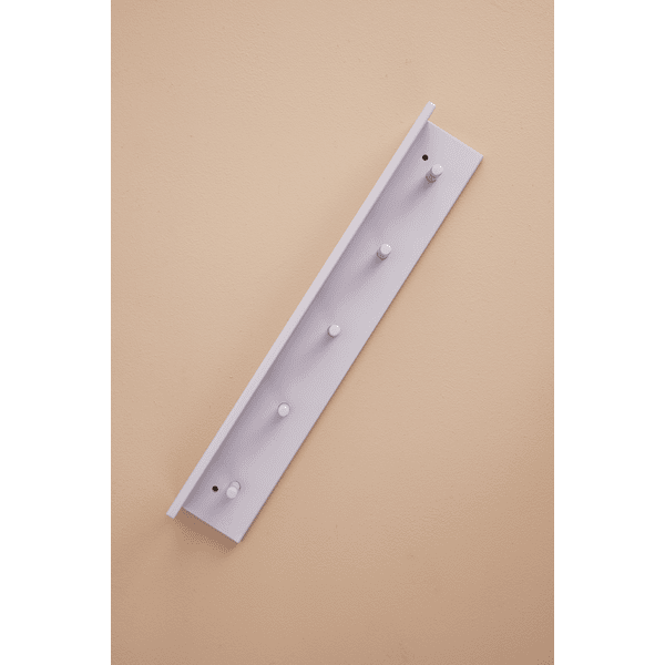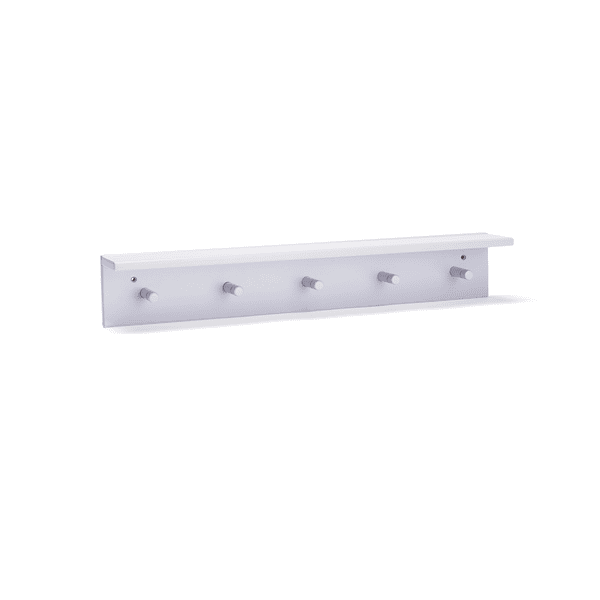 Estantería y tabla de ganchos en uno. Los 5 ganchos están distribuidos uniformemente, por lo que se pueden colocar varios estantes uno al lado del otro. Disponible en 4 colores diferentes.