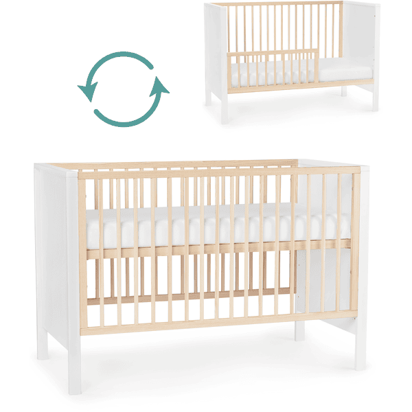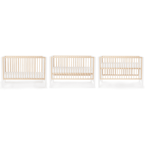 La cuna está hecha de madera de pino segura y duradera. Su minimalista y