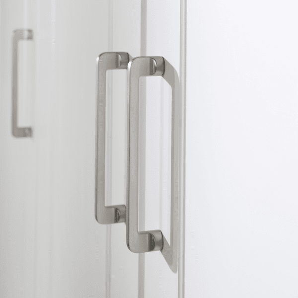 La carcasa tiene 199 cm de altura para tener más espacio de almacenamiento y está hecha de un tablero de aglomerado recubierto de melamina, especialmente resistente.