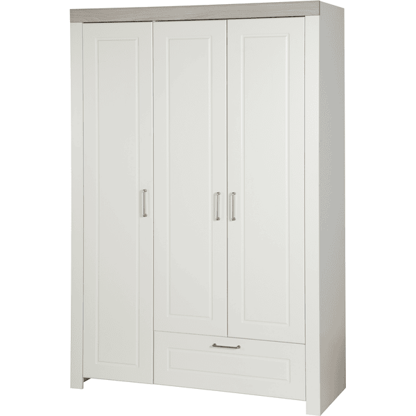 El armario infantil en blanco con panel superior en decoración Luna Elm está equipado con un elaborado fresado de casetes, asas de alta Metal calidad y tacos laterales y encaja perfectamente en cada habitación de bebés y niños.